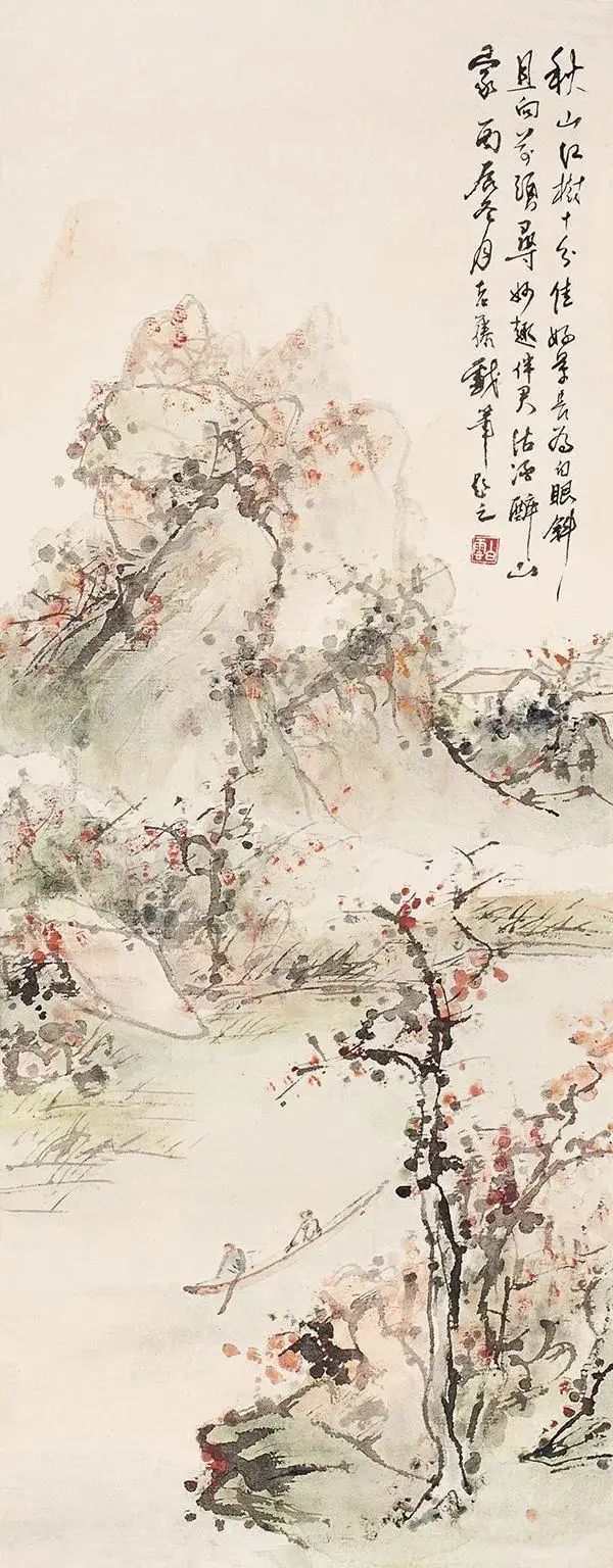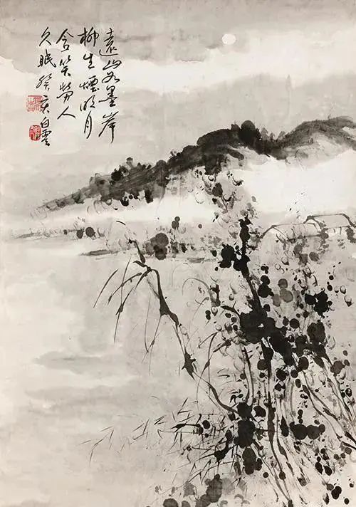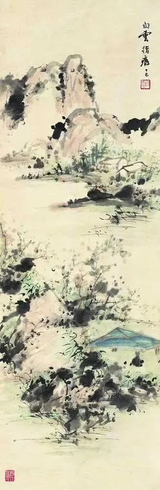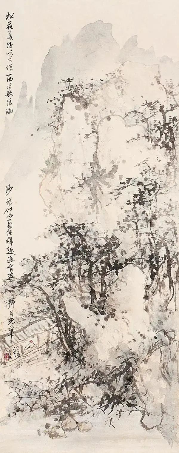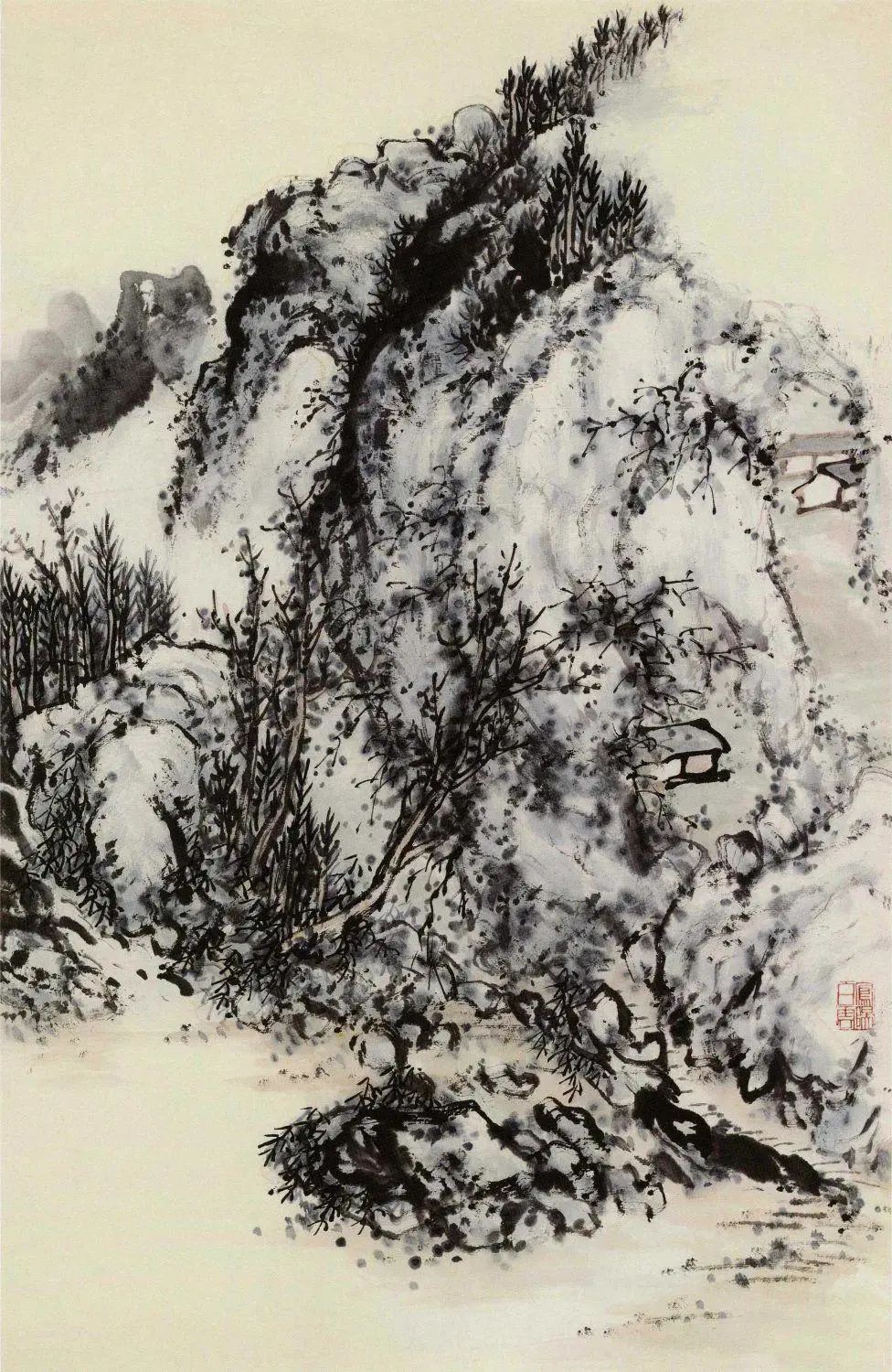 刘知白的指画中大片山石、林树借以寥寥数笔写出,但画面不乏生趣,而虚部和晦明的效用热烈,又能足够着一种荒废野逸之气,作风超逸,臻于化境。