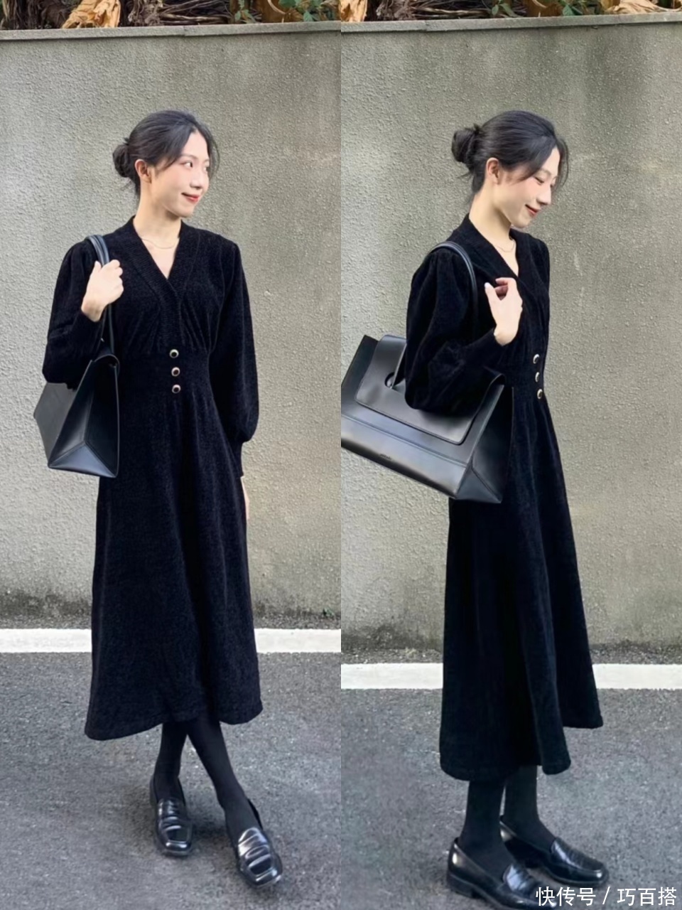 这类长裙最经典的上风即是心境举座样式毛糙但能凹出生体线条,博主身上这类纯玄色高收腰百褶裙就终点稳健选款方法,小V领的紧密和同色系打底衫、小皮鞋的庄重相反相成,走亲访友、外出逛街,稳赚回头率。